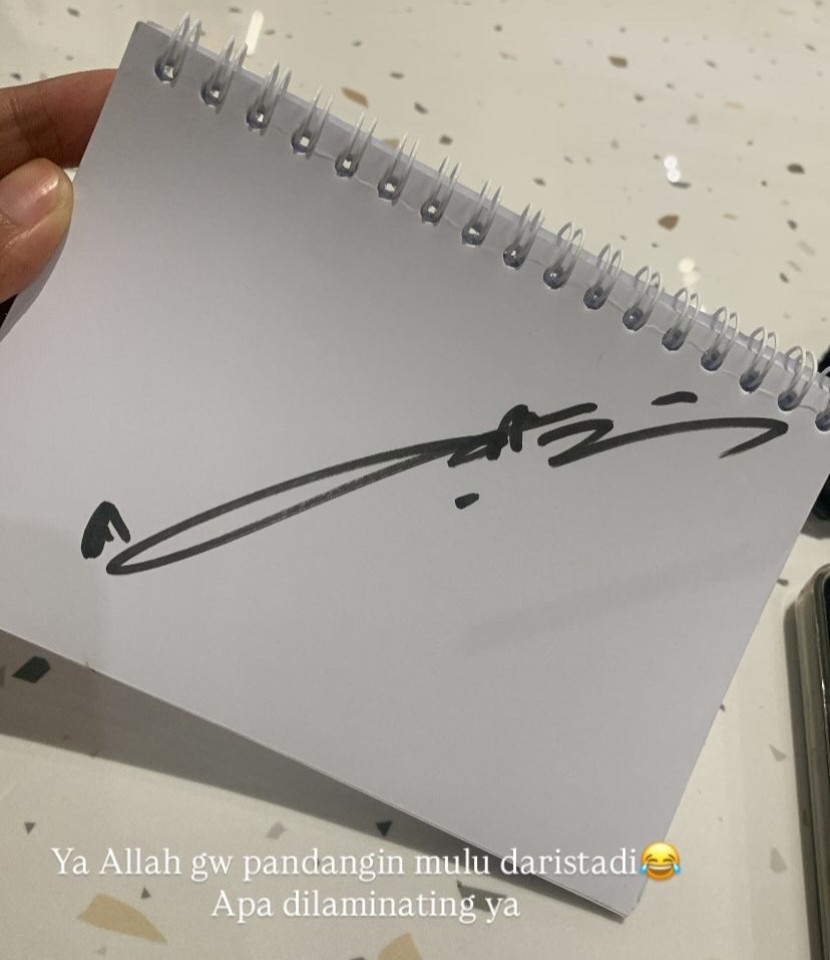 Awalnya seperti mau lewat begitu saja lagi. Tapi tiba-tiba dia berhenti. Menoleh. Dan jalan mendekat. Serius. Jalan mendekat. Tangannya mengambil notebook dan spidol dari tanganku, lalu menandatangani halaman kosong itu.